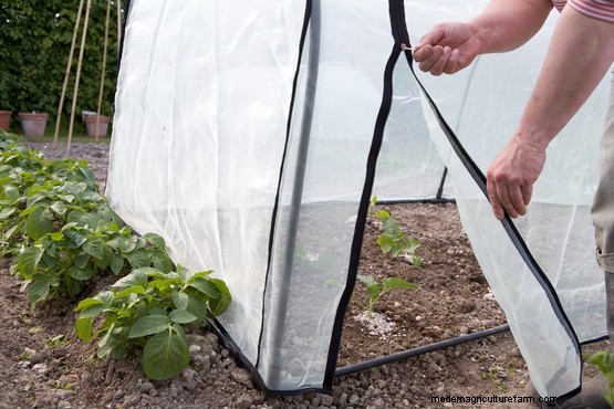 A cover for protecting plants from cold and pests. Can be made using netting, horticultural fleece or plastic, depending on what you’re using it for.