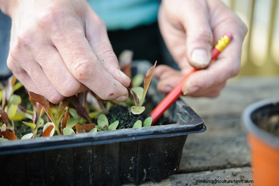 Moving tiny seedlings from pots or trays into new pots, to give them more room when their first true leaves appear.