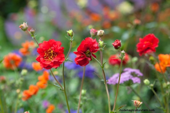 - Geum ‘Mrs J. Bradshaw’ – bright red summer flowers. Enjoys full sun. A popular plant for its height of 75cm