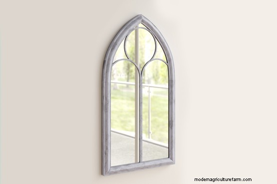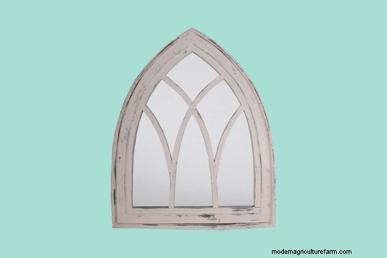 This Gothic-style mirror has a white-washed wooden frame which has been distressed to create a vintage look. The arched shape and ornate cross-over detail add interest further interest, helping it stand out as a stylish focal point in the garden.