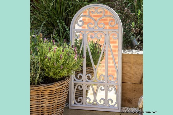 If you’re looking for shabby chic garden mirror ideas, this decorative frame might be a good choice. The shutters on the mirror disguise it as an ornate window when closed and frame it beautifully when opened. The shutters also mean you can cover the mirror to avoid confusion from birds when it’s not in use.