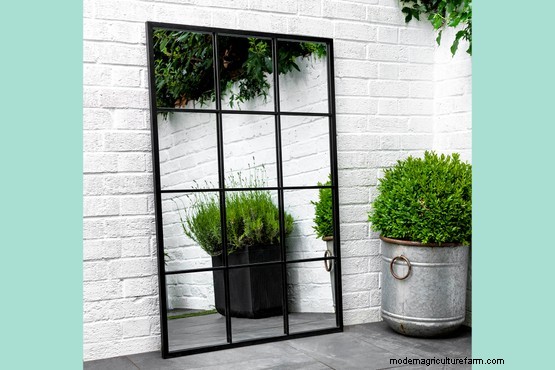 For garden mirror ideas which create the illusion of extra space, this Fulbrook design is an ideal choice. Designed to look like a Georgian window, with neat square panes for an understated approach. The classic black frame has a contemporary feel and is made from steel for extra durability.
