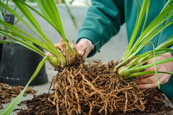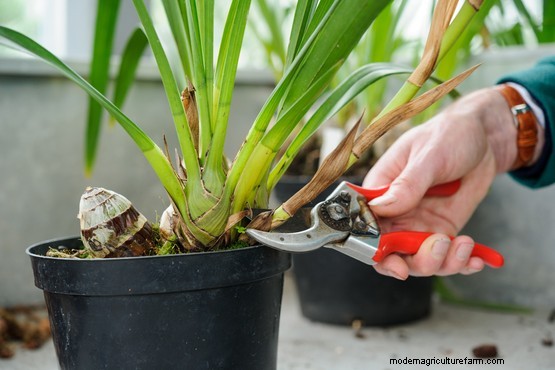 If the plants look like they’ve outgrown their pot, you can divide them, using a sterile knife to cut the rhizome. Divisions should have three bulbs each. Plant these up into pots filled with damp orchid compost. Don’t water for at least three weeks, using a spray just to stop the plant from completely drying out.