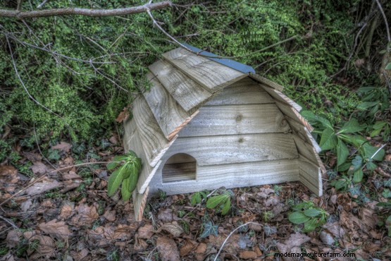 The hedgehog house should be put in the most secluded area of the garden – behind the shed works well – and covered in soil and leaves. Any location should be out of direct sunlight and out of wind and rain.
