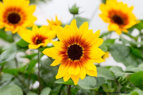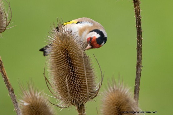 In summer, sunflowers provide forage for bees, but their seeds are an important winter food, packed with seeds, for birds. When their seed is ripe, cut sunflowers with long stems and hang them in a dry place. In winter, tie them to canes pushed into the ground or hang them from the washing line.
