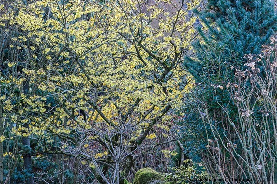 This witch hazel is irresistible and one of the first to flower. Its slender-petalled, pale-lemon blooms often open in early December, and have a wonderful scent – a mix of honey and nutmeg – that carries well. It’s strange to associate cold winter days with such sensual pleasure, but perhaps this is what makes it so appealing? The flowers show up well against a dark backdrop – a yew hedge, ivy covered wall or just a dark fence.