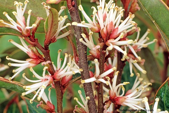 Christmas box, or sweet box, is one of the most desirable winter-flowering shrubs. As temperatures start to fall, it fills the air with sweet perfume, wafting from its small whitish flowers for several months. It will grow just about anywhere except in a bog, isn’t fussy about soil pH, likes shade, and throughout the year is a quiet evergreen presence, with slender pointed leaves.