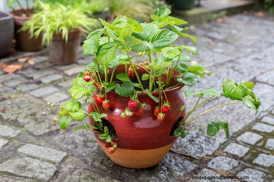 Either in tiered or ordinary pots, you’ll enjoy a surprisingly good yield from strawberries, especially if you plant several varieties that fruit from early summer to autumn. Remember to remove the long runners and to protect the flowers from frost.