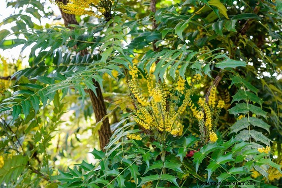 Mahonia, also known as the Oregon grape, has dramatic, evergreen foliage and clusters of fragrant, yellow flowers in autumn and winter that are much appreciated by bees. The flowers are followed by blue-back fruits that are enjoyed by birds. Mahonias prefer a shaded spot and look good with contrasting foliage plants that also thrive in shade, such as elephant’s ears and epimedium. They also look good in a jungle-style border or exotic planting scheme.