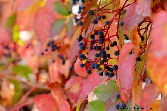 Virginia creeper, Parthenocissus quinquefolia, is a rampant climber. It is typically used to clothe walls of large houses. It bears inconspicuous flowers in summer, followed by small blackberries in autumn. Its autumn colour is unrivalled – its fresh green leaves turn glorious shades of red and orange before falling.