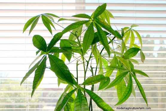 Pachira plant thrives in a humid environment, so a bathroom is an ideal place for it. It also does well under fluorescent light, so it’s great for office environments.