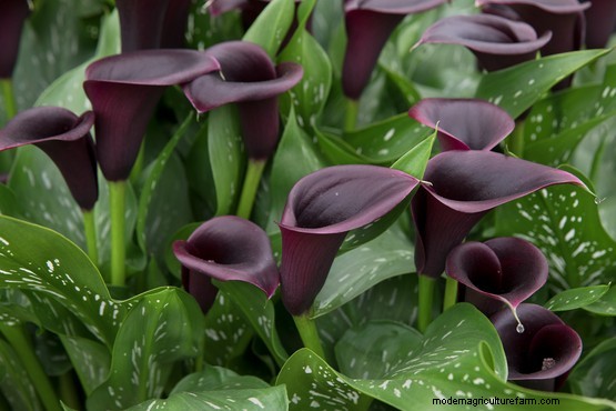 - Zantedeschia ‘Odessa’ has almost black flowers that make a striking contrast to the silver-flecked foliage.