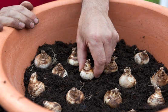 If planting bulbs in containers, add a few crocks at the bottom to help with drainage. Then add a layer of compost. You can layer bulbs, planting later-flowering varieties such as tulips at the bottom, and earlier flowering varieties, such as crocus, at the top. This ‘lasagne’ style of planting is a great way to save space. If planting spring bulbs in the ground, you can naturalise them in a lawn by digging up divots and popping the bulbs in to three times their own depth. Or you could plant a group around a tree, a little closer to the surface. Many bulbs will benefit from adding a handful of grit to the hole, as winter wet may cause them to rot. Read more about planting spring bulbs in autumn.
