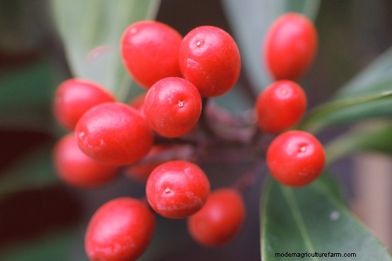 Skimmia varieties are male, female, or hermaphrodite. If female and male varieties are grown near each other, the female will produce berries. Hermaphrodite varieties are best for small spaces as they produce berries on their own. The fruits can cause mild stomach upset if eaten. Skimmia size varies according to variety and ranges from 50 to 150 cm high and wide.