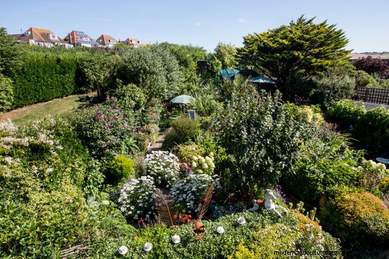 The small front garden takes full advantage of the views out to sea and has a distinctly coastal feel to the planting, enhanced by lobster pots and a dinghy. While the 30m-long rear garden is packed with a colourful jumble of bedding plants, perennials and shrubs, combined with rusted metal sculptures, an eclectic mix of objects and several seating areas tucked amongst the plants.