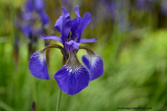Siberian flag iris, Iris sibirica, produces small, delicate flowers and narrow, bright green foliage. Flower petals are purple with white and yellow markings. Iris sibirica ‘Blue King’ bears deep violet flowers with veined yellow throats.