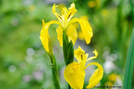 Yellow flag iris, Iris pseudacorus, is a vigorous water iris, typically found growing at the edges of large, sunny ponds. It bears large clumps of green leaves from which elegant, yellow flowers appear in late-spring.