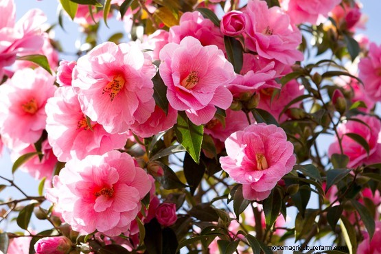 Camellia sinensis are evergreen shrubs that bear rose-like flowers in shades of white, pink and red in February and March. They do best in a shady spot, and need acidic soil. If you don’t have this type of soil, camellias grow very well in pots of ericaceous (acidic) compost.