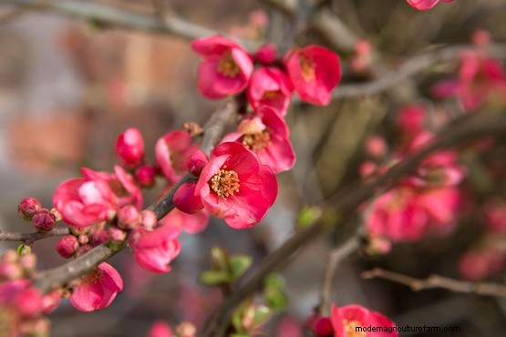 Japanese quince (Chaenomeles japonica) is a wall shrub with beautiful white, peach or crimson flowers from March to May. Later in the year, it may produce green or yellow quinces, which can be made into jelly. It will thrive in most soils and in any aspect.