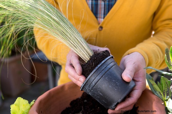 If growing Stipa tenuissima in a pot, make sure your chosen container has drainage holes at the bottom. Add some crocks at the base, then plant into peat-free multipurpose compost with some grit or perlite added to aid drainage.