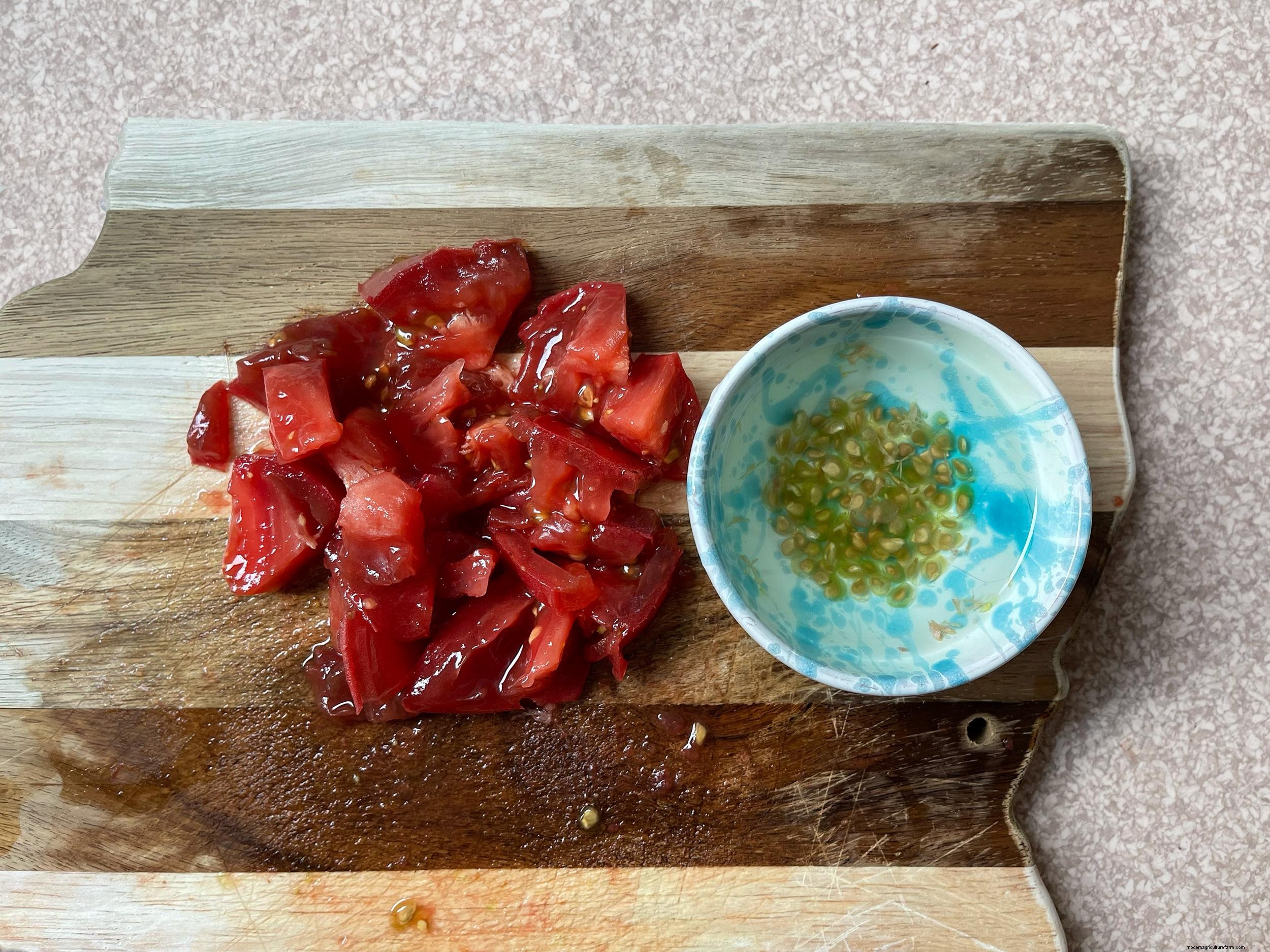 - Separate the seeds from the flesh and rinse them in a strainer. For tomatoes, tomatillos, and kiwis, you should take it a step further and let the seeds soak for 2 to 3 days to get rid of the goo.