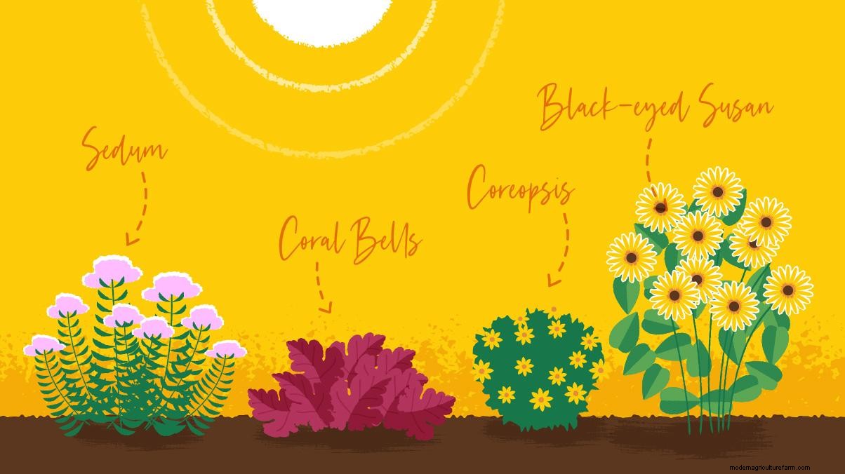 Perennials with fall color: sedum, coral bells, coreopsis, gaillardia, black-eyed Susan, salvia, allium, sweet flag, blue star