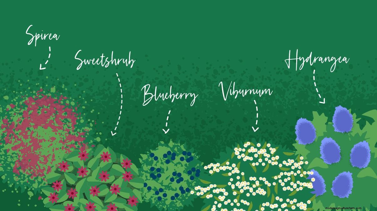 Shrubs: Hydrangea, beautyberry, sweetshrub, blueberry, spirea, viburnum, sumac