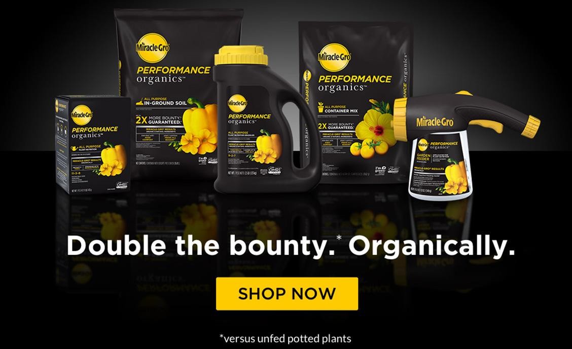 This is usually thanks to adding either nutrient-filled soil products that are specifically blended for the planting spot or pot , or a lot of compost. Miracle-Gro® Performance Organics® All Purpose In-Ground Soil (for in-ground gardens) or Miracle-Gro® Performance Organics® All Purpose Container Mix (for potted plants) is a super-simple way to do both. Blended with aged compost and just the right organic nutrition to get plants off to a strong start, both products make it easy to grow a flourishing organic garden. In fact, they’re guaranteed to deliver up to twice the harvest (vs. unfed plants) during the growing season!