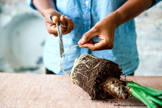 Remove the plant from its pot and use sharp scissors to cut pieces of thick, fleshy root around 10cm long.