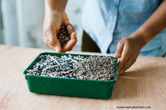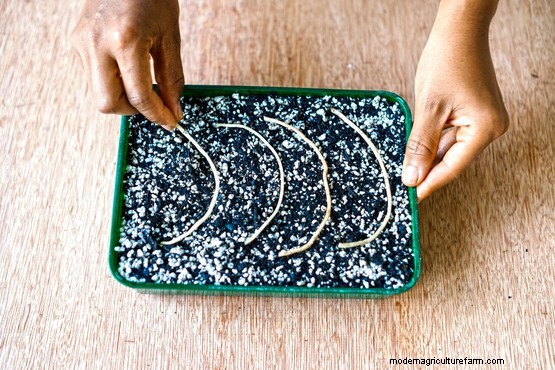 Mix peat-free compost with perlite (around a ratio of 70:30) and firm it into a tray. Lay the root cuttings flat on the compost mix, leaving about 2cm between them.