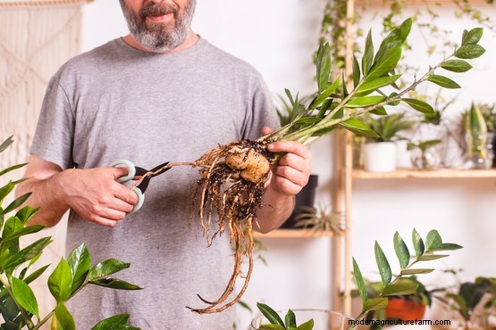 ZZ plants can be propagated by dividing the tubers. Take the plant out of its pot, separate some of the rhizomes, trim the roots a little and plant into smaller pots. Water in well. Don’t do this too often, though, as the plant is slow produce new tubers. You can also take cuttings – remove a section that has around two leaves and a section of stem. Allow the base to harden over for a few hours, then place in a pot filled with a 50:50 mix of multipurpose compost and perlite. Place in a warm spot. It may take up to a year for a new plant to form.