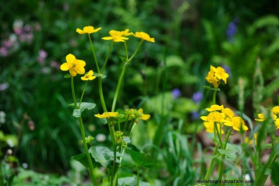 An attractive pond plant, Caltha palustris has bold glossy leaves, and yellow, buttercup-like flowers on tall stems in late spring and early summer that draw in pollinating insects. This marsh marigold grows naturally alongside streams and in shallow water around ponds, ditches and wet woodlands, and is a good plant for a shady pond. It’s a strong clump-forming plant, so best planted in baskets in shallow water at the edge of a pond, and divided every couple of years.