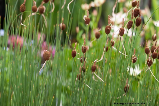 Miniature rushes are perfect for container ponds, and this compact bulrush, or dwarf reed mace, is a great option. Narrow male flower spikes on top of oval female ones add interest in a small space. Grow Typha minima in a basket to stop it from spreading too rapidly.