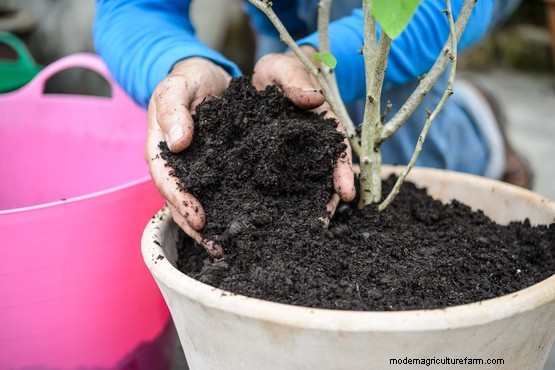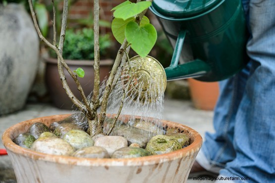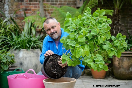 After four or five years, most trees will need to be re-potted, either into a slightly larger pot or you can snip off some of the outer roots and replant into the same pot with fresh compost.