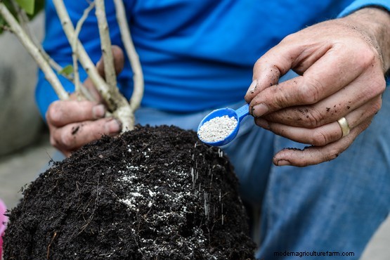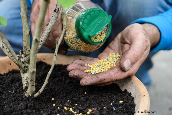 Tease apart some of the roots around the edges and base of the rootball with your fingers. Sprinkle mycorrhizal fungi granules over the damp roots, so that they stick to the surface.