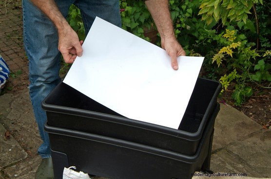 Cover the paper with the compost bedding mixture, spreading it out in an even layer.