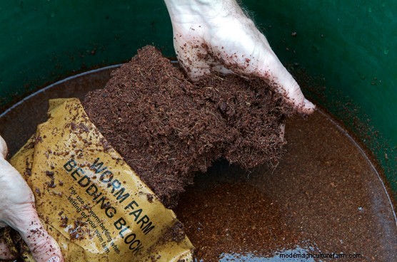 Soak the worm bedding block (made of coir compost) in warm water, before breaking it up into a friable mass.