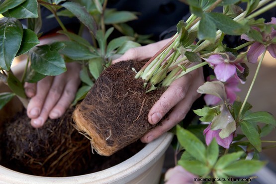 Add the plants one at a time, with the evergreen at the back. Pack them in tightly.
