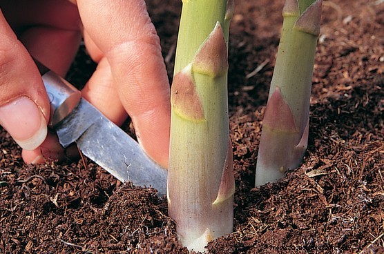 Asparagus is ready to harvest two years after planting one-year-old crowns. Harvest spears when they reach 12cm in length, cutting them off the crowns beneath the soil with a serrated knife. Stop harvesting in mid-June to allow the plant to build up energy for the following year.