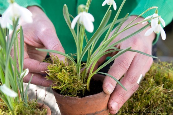 Carefully remove the snowdrops from their pots, being careful not to disturb the soil, and place inside your clay pots (add potting compost first, if necessary).