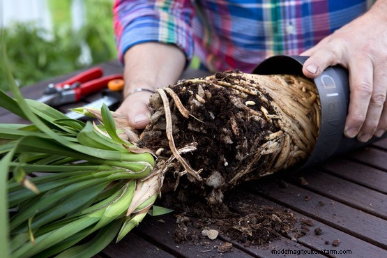 Divide the plant into pieces, using a saw, old bread knife or secateurs, making sure that each piece has at least three pseudobulbs. Remove any roots that are withered and dead, and scrape away some of the old compost.