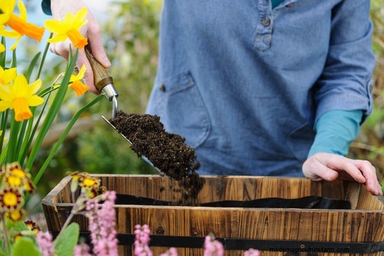 Line the trough with an old compost bag, to prevent it from drying too quickly. Then, fill the trough roughly halfway with multi-purpose compost.