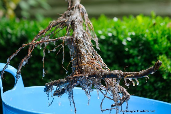 Bare-root trees should be soaked in water before planting. If the tree is potted, make sure it’s watered well before planting. Just before placing in the hole, dip the roots in mycorrhizal fungi, or for potted trees, sprinkle a handful over the rootball and in the planting hole.