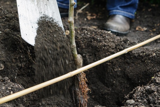 Back-fill with soil, holding the tree at the right height and gently jiggle it to work the soil in around the roots. Firm gently as you go.