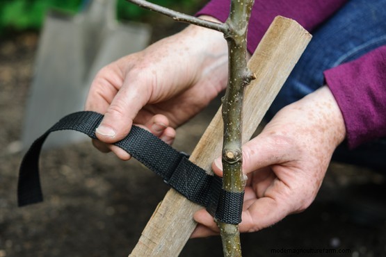 Drive in a stake at a 45º angle, pointing into the prevailing wind. Secure the stem to the stake one third of the way up the trunk.