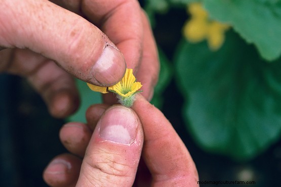 Melons produce both male and female flowers. The female flower has a fruit developing behind the bloom whereas the male flower has a thin stalk. Insects normally pollinate the flowers, but in a greenhouse, you may need to hand-pollinate them. First identify the female and male flowers, looking for the fruit behind the female and the thin stalk behind the male.