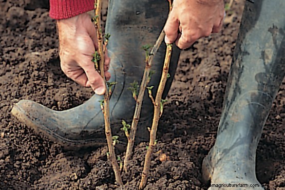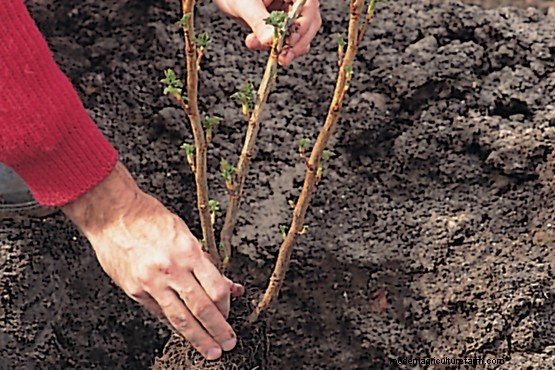 Choose an open and sunny site. Fork over a wide area of ground, then dig a hole deep enough to accommodate the roots of your fruit bush.