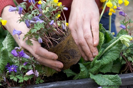 Add the anemones, placing them in the the gaps between the cowslips. Anemones are delicate so take care not to break them when planting.