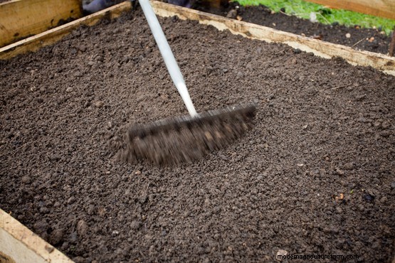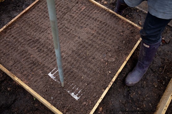 Use the back of the rake to do a final surface preparation before drilling lines or broadcast sowing your spring seeds. If you can’t reach the bed when sowing, stand on boards to avoid making footprints.