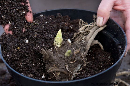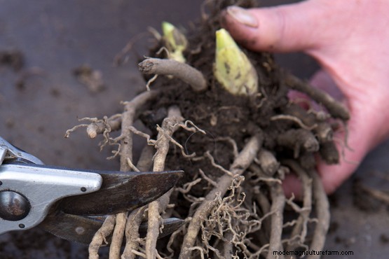 Dig up the clump, then cut it into smaller sections, each with one or more pointed buds and plenty of roots. Trim the roots to fit in a pot.